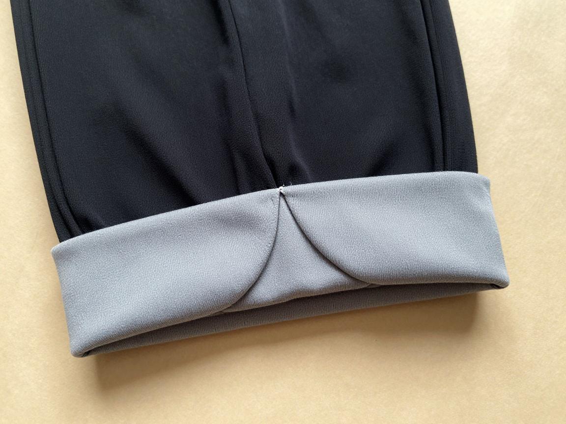 内折处理:将裤脚底部内折2cm左右,这是因为弹性面料需要一定的折边宽度来保持下垂感