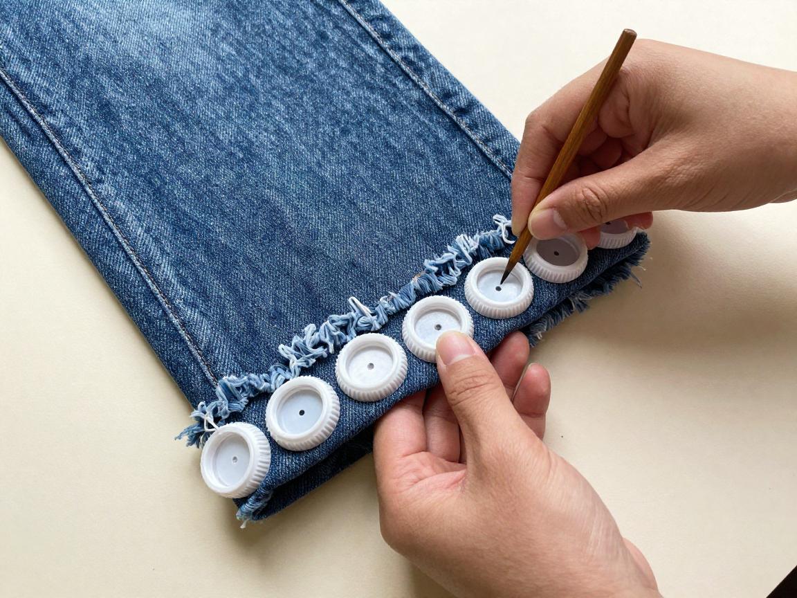 将裤腿平整铺开,用瓶盖轮廓在裤脚边缘画出连续的半圆形曲线。然后用剪刀沿着画线仔细裁剪。为保证两侧对称,最好同时处理两条裤腿,对照着进行裁剪。